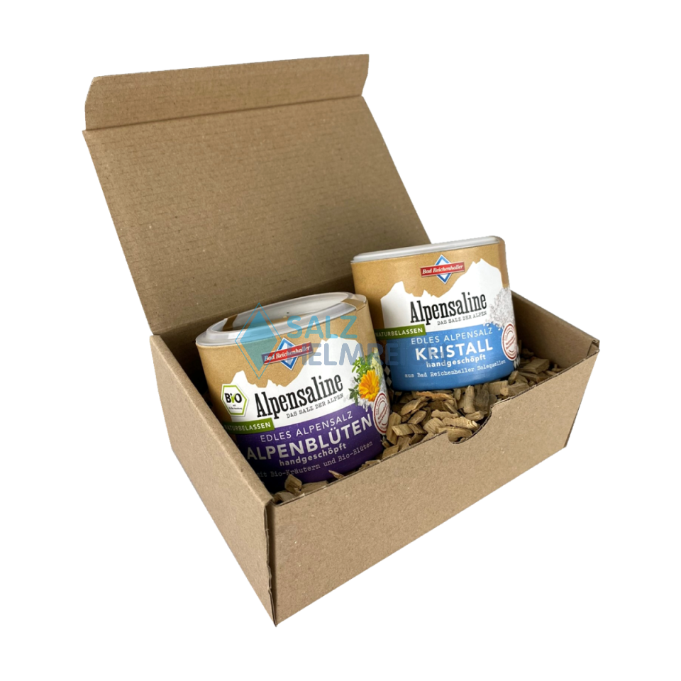 Alpensaline Alpenblütensalz 80g und Alpensaline Kristallsalz 100g,exklusiv als Geschenkset gebettet in Holzchips.