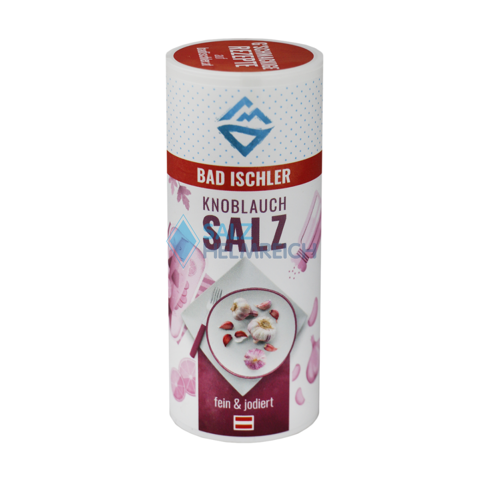 Knoblauch Salz von Bad Ischler in der 90g Streudose. Gewürzsalz mit Knoblauch, fein und jodiert. Zum Verfeinern und Würzen von Gemüse, Fisch- und Fleischgerichten, Saucen, Aufstrichen und vielem mehr.