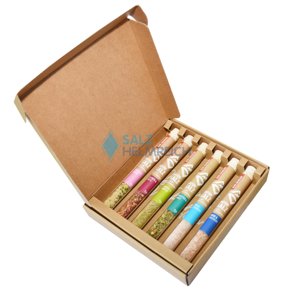 Die Natursalz Provetten Samplingbox ist die ideal Probierpackung. Enthalten sind die vier verschiedenen Natursalz Gewürzmischungen sowie das pure Natursalz in grob und fein. Als schönes Geschenk oder zum selber verwöhnen.