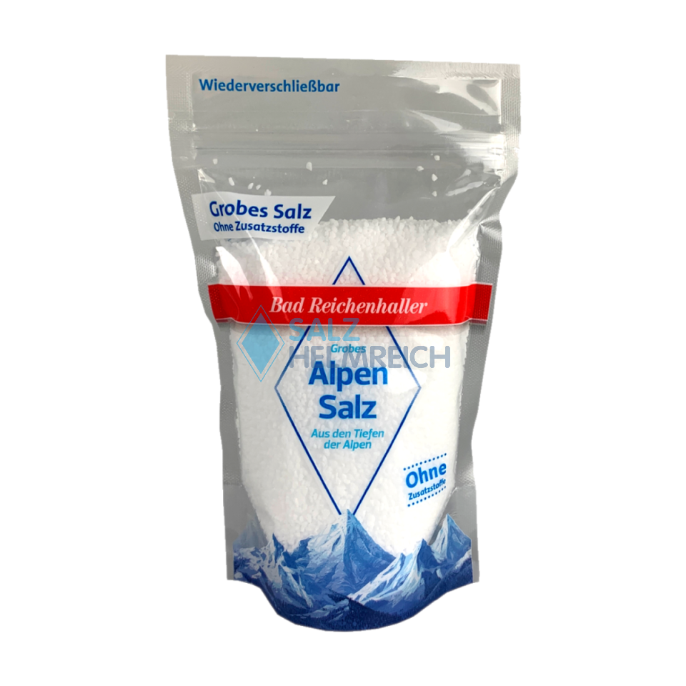 Bad Reichenhaller grobes Alpensalz im wiederberschließbaren 500 g Beutel. Das Salz enthält kein zugesetztes Jod, Fluorid oder Folsäure.
