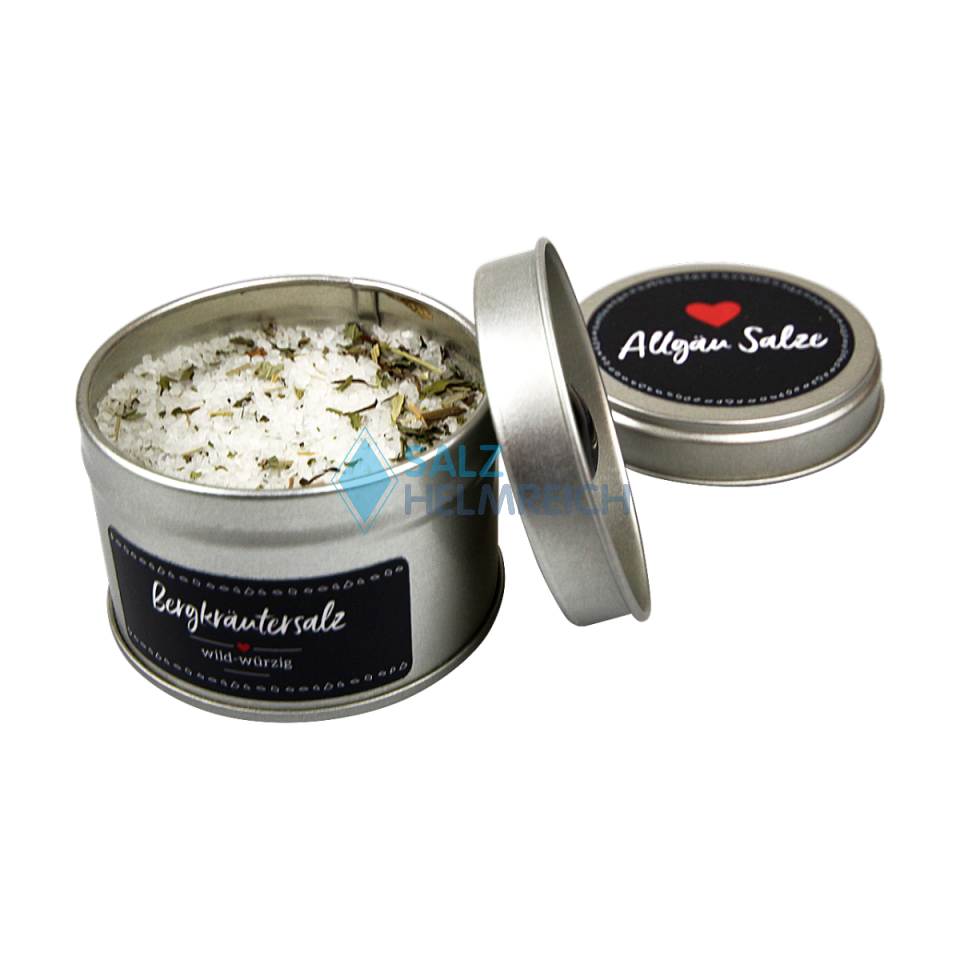 Bergkräutersalz ein absoluter Gewürzallrounder. Grobes Meersalz gemischt mit den heimischen Gewürzen oder Blütenblättern aus der allgäuer Region.