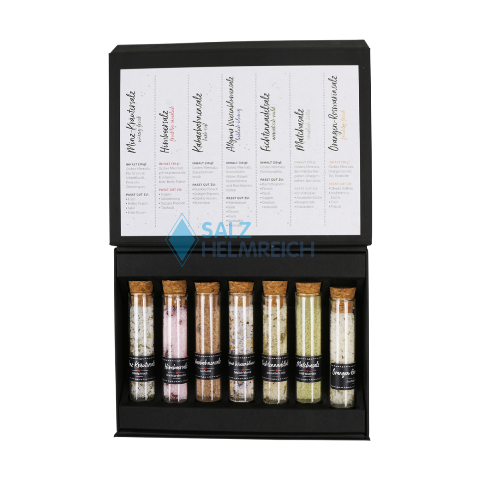 Das perfekte Geschenk für alle Lieblingsmenschen, Hobbyköche oder Genussmenschen. Die gesamte Vielfalt der Allgäu Salze in einer hochwertigen und nachhaltigen Geschenkbox mit Magnetverschluss.