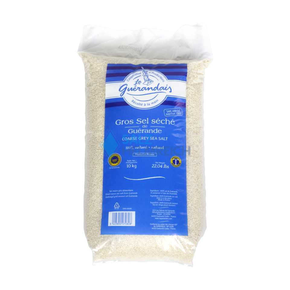 Le Guerandais Gros Sel de Guérande, auch bekannt als Sel Gris, ist ein trockenes, grobes Atlantik-Meersalz. Es ist reichhaltig an Mineralien und ohne Zusatzstoffe. Das beliebte graue Meersalz wird in den Salzgärten im Süden der Bretagne auf der Halbinsel Guérande gewonnen. Dieses hochwertige, grobe Meersalz ist perfekt für Genießer, die Wert auf Qualität und Tradition legen!