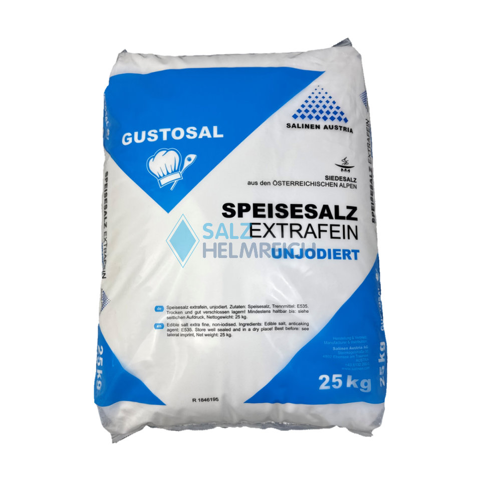 Das Gustosal Speisesalz extrafein ist ein unjodiertes Siedesalz in besonders feiner Körnung (0,1-0,5 mm). Es eignet sich hervorragend für die Lebensmittelverarbeitung, Bäckereien, Großküchen und industrielle Anwendungen. Durch das enthaltene Trennmittel bleibt das Salz rieselfähig und einfach zu dosieren – auch bei längerer Lagerung.