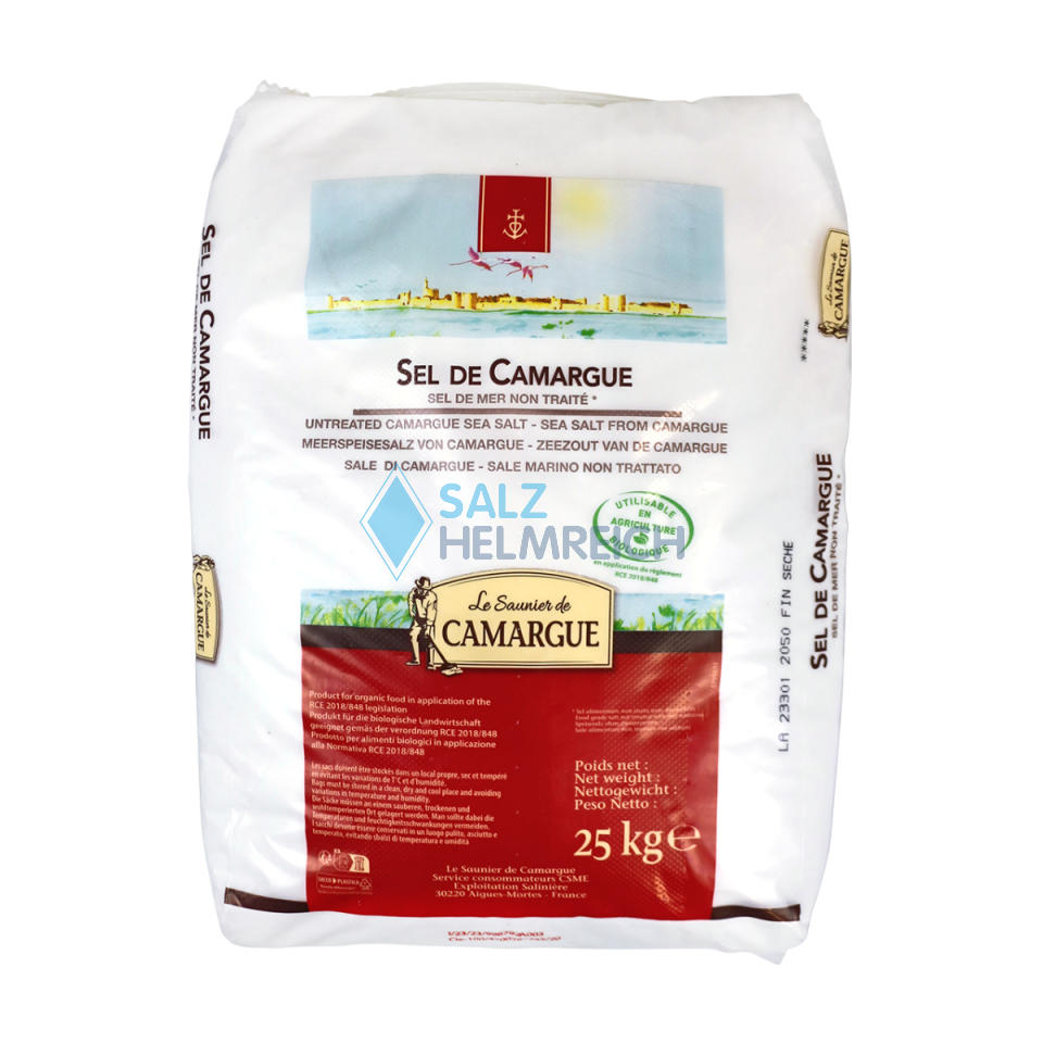 Le Saunier de Camargue fein getrocknet im 25 kg Sack. Das gemahlene Camargue-Salz ist ein einzigartiges, natürlich weißes Salz, das in den Salinen von Aigues-Mortes gewonnen wird.