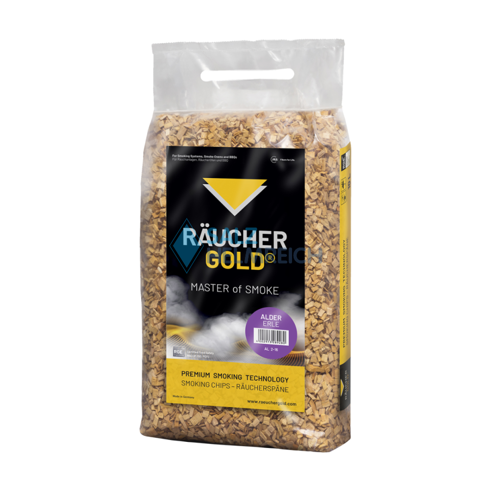 Räuchergold® Räucherchips aus Erle sind mit einem Kornbereich von 6,0-10 mm für Nahrungsmittel aller Art (Fleisch-, Fisch- und Käseräucherei) geeignet. Räuchergold wird hochtrocken, staubfrei in unterschiedlichen Körnungen und der immer gleichen Qualität geliefert. Der milde Edelrauch erzeugt ein äußerst delikates, rauchzartes Aroma. Kräftiger süß-herzhafter Barbecue-Geschmack garantiert. Feuchtigkeitsgehalt von ca. 13 %. Im praktischen 10 Liter Sack.