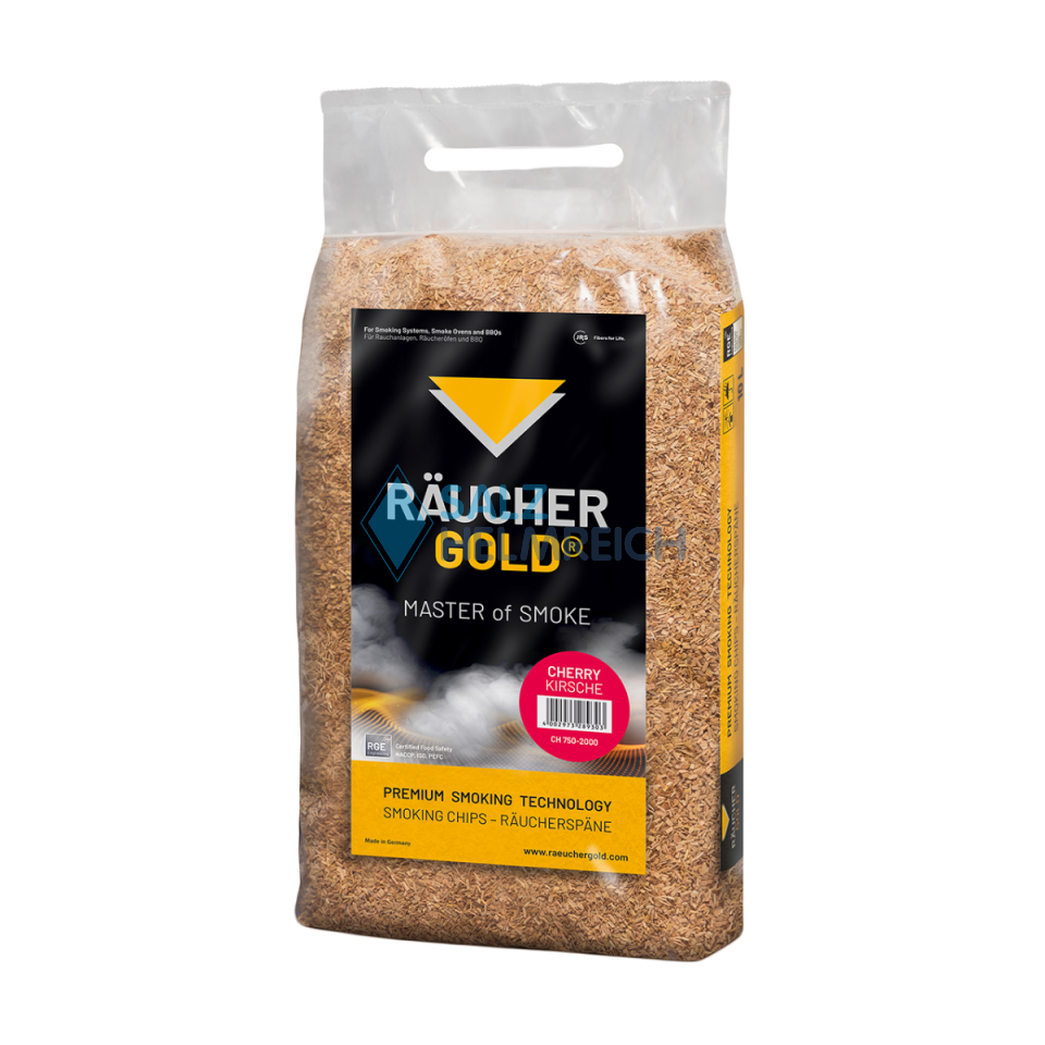 RÄUCHERGOLD® CH 750-2000 Räucherspäne aus Kirschholz sind durch ihre milde Rauchnote mit einer fruchtigen Nuance perfekt für das Räuchern von Schwein, Lamm, Fisch, Geflügel und Gemüse geeignet. Mit einer feinen Körnung von 1,2 – 1,8 mm werden sie für Glimmrauch in Vollautomaten mit teiloffenen und offenen Rauchsystemen eingesetzt.