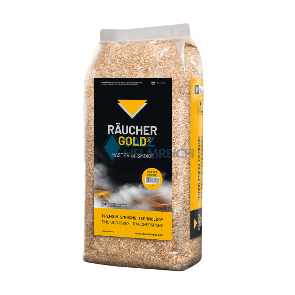 RÄUCHERGOLD® KL 1-4 Räucherspäne aus Buchenholz sind durch ihre ausgewogene Rauchnote perfekt für das Räuchern von allen Lebensmittel geeignet. Mit einer Körnung von 2,5 - 3,5 mm werden sie für Kondensatrauch in vollautomatischen Raucherzeugern eingesetzt.