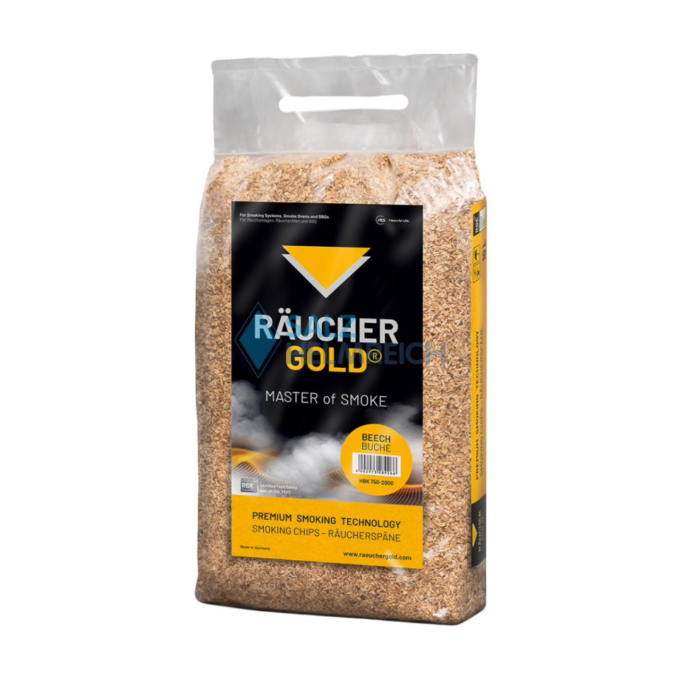 RÄUCHERGOLD® HBK 750-2000 Räucherspäne aus Buchenholz sind durch ihre ausgewogene Rauchnote perfekt für das Räuchern von allen Lebensmittel geeignet. Mit einer feinen Körnung von 0,75 - 2,5 mm werden sie für Glimmrauch in Vollautomaten mit teiloffenen und offenen Rauchsystemen eingesetzt.