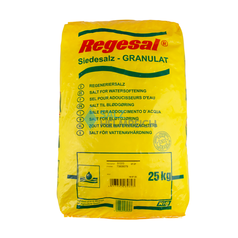 Regesal kompaktiertes Siedesalz, ohne Trennmittel, für die Wasserenthärtung, Wasserdesinfektion und Soleerzeugung im Lebensmittelbereich. Das Granulat hat eine Korngröße von 5 - 20 mm.