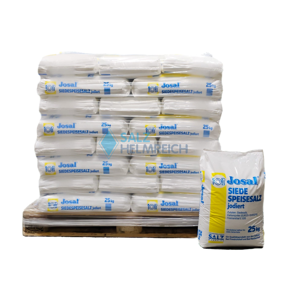 Das JOSAL Siedespeisesalz jodiert, fein im 25kg Sack, ist das am üblichsten für menschliche Ernährung verwendete Salz. Siedespeisesalz dient in der Nahrungsmittelproduktion als Geschmacksträger, Konservierungsmittel und als idealer Trägerstoff für gesundheitsfördernde Zusatzstoffe. Zusätzlich zum exklusiven Würzen der Nahrungsmittel aller Art, ist das Speisesalz bei der Herstellung von Fleisch- und Wurstwaren, Brot und Käse nicht zu ersetzen. Durch den Zusatz des Trennmittels „Antibackmittel E535“, bleibt das Salz allzeit einsatzbereit. Das beigefügte Jod ist zusätzlich gesundheitsfördernd.