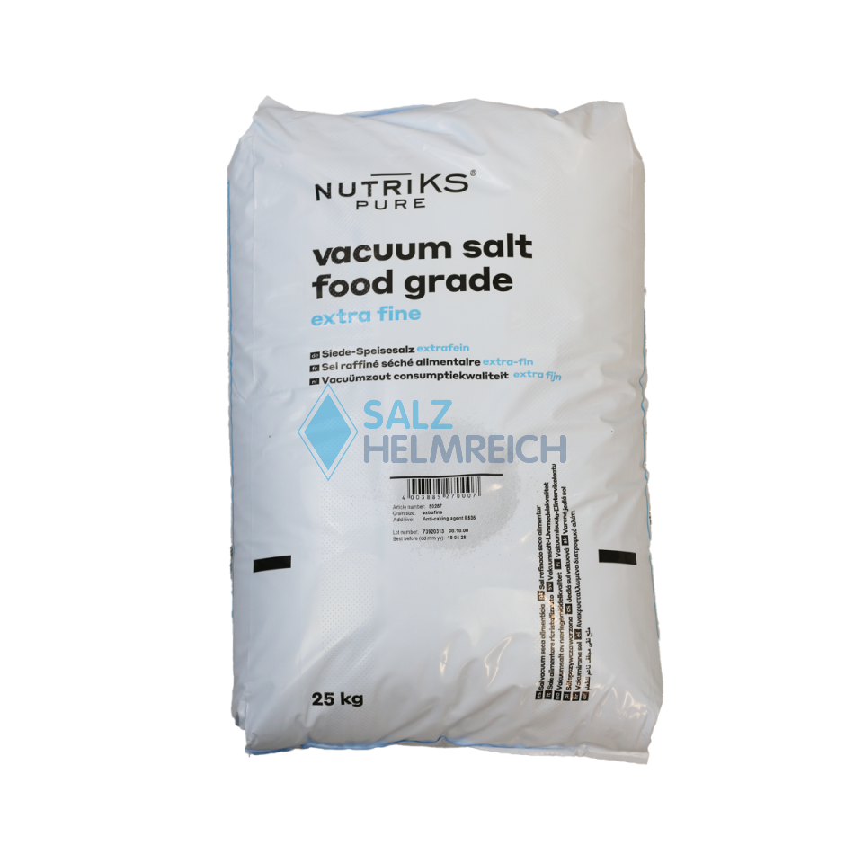 Siedespeisesalz, fein im 25kg Sack, ist das am üblichsten für menschliche Ernährung verwendete Salz. Siedespeisesalz dient in der Nahrungsmittelproduktion als Geschmacksträger, Konservierungsmittel und als idealer Trägerstoff für gesundheitsfördernde Zusatzstoffe. Zusätzlich zum exklusiven Würzen der Nahrungsmittel aller Art, ist das Speisesalz bei der Herstellung von Fleisch- und Wurstwaren, Brot und Käse nicht zu ersetzen. Durch den Zusatz eines Trennmittels bleibt das Salz allzeit einsatzbereit.